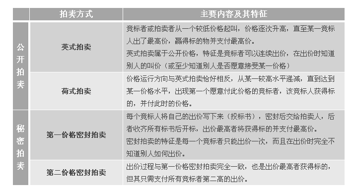 西方经济学家William Vickrey、Milton Freidman以及Paul Migrorm等都提出过自己的招标理论。由于规则的差异,现实生活中有多种拍卖方式,但基本的拍卖方式可归纳为四种👇🏻,被称为“标准拍卖”🧜🏻♀️:英式拍卖(English Auction)🚟、荷式拍卖(Dutch Auction)、第一价格密封拍卖(First Price Sealed bid,简称FPSB)和第二价格密封拍卖(Second Price Sealed-Bid,简称SPSB📋👵🏿,这一机制由Vickrey于1961年提出,所以也称Vickrey拍卖)。其中前两种属于公开招标🍳,后两种属于秘密招标。秘密招标和公开招标之间的根本区别并不是招标拍卖本身是否公开,而是各个投标者的竞标信息是否能够共享👨🏼🦲。