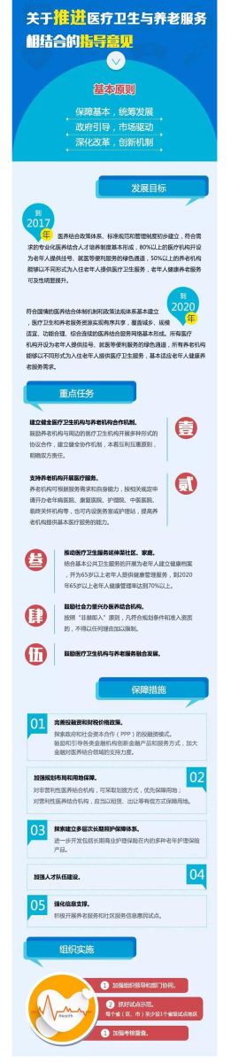 三、统一部署和多部门协调落实👨🏽🎨。医养结合是一项重要的制度创新🧙🏻,《意见》从组织保障上充分考虑到医疗与养老跨领域的协调工作难度,统一部署9个部委的工作任务,发改委将医养结合纳入规划,卫生、民政负责建设规划衔接和审批环节的合作协调,国土资源部负责落实土地规划等,人力资源部等医养结合机构纳入医保体系,各部门强化职责划分,加强协同配合,协同推进医养结合养老模式发展。