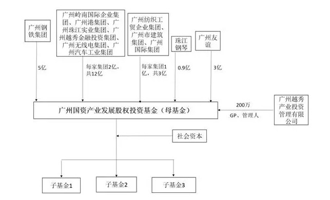 2013年4月,由广州市国资委牵头,越秀集团、无线电集团💗、珠实集团等共12家市属国企发起设立“广州国资产业发展股权投资基金”🕡。该基金采取“母基金+若干子基金”架构,初始母基金24.02亿元🪪✌🏽,不直接从事具体的投资业务👨❤️💋👨;针对特定项目设立子基金,母基金出资20%至50%👨❤️💋👨😒,作为劣后级投资人,剩余份额向社会募集🐈⇒,社会投资人为优先投资人🥳🥙。基金的普通合伙人和管理人均为广州越秀产业投资管理有限公司📥,后者出资200万元占基金认缴总额的0.08。根据广州市国资委报告🉐,至2013年11月底,国资基金母子基金实现管理规模149.62亿元,撬动社会资金134.47亿元🫣✍🏼,有力支持了地产👱🏿、生物医药等产业加速发展😧🧍♀️。
