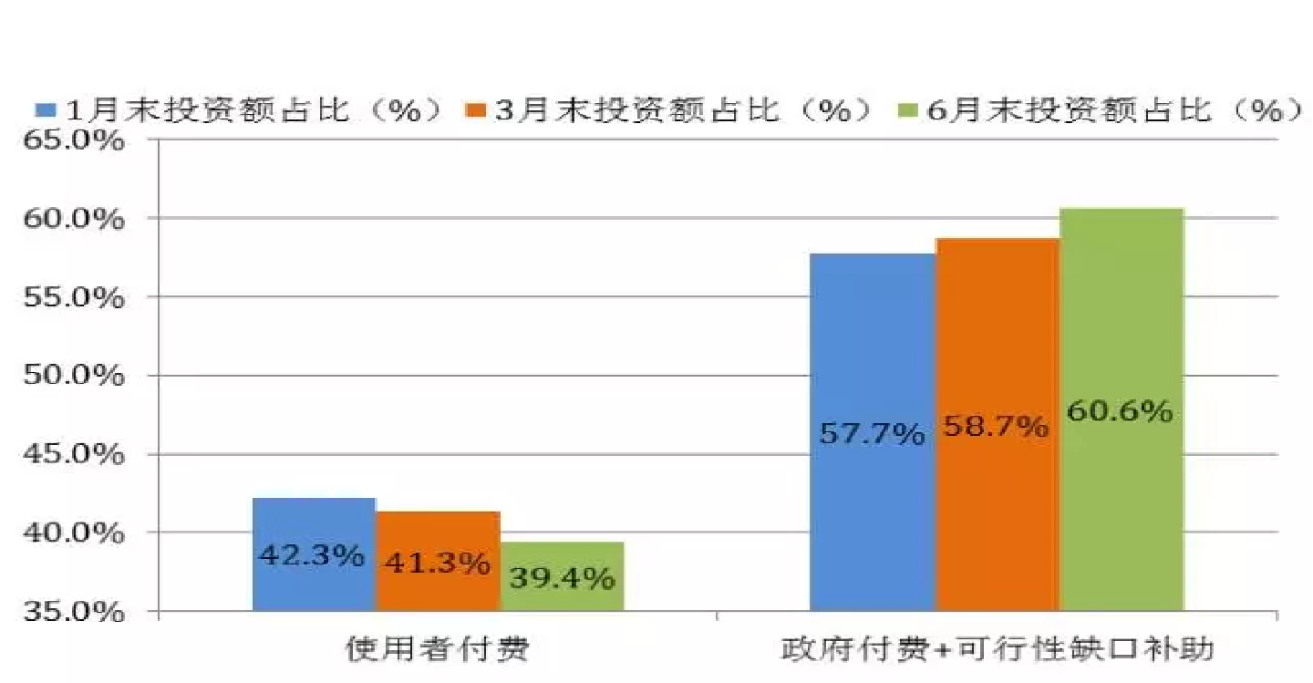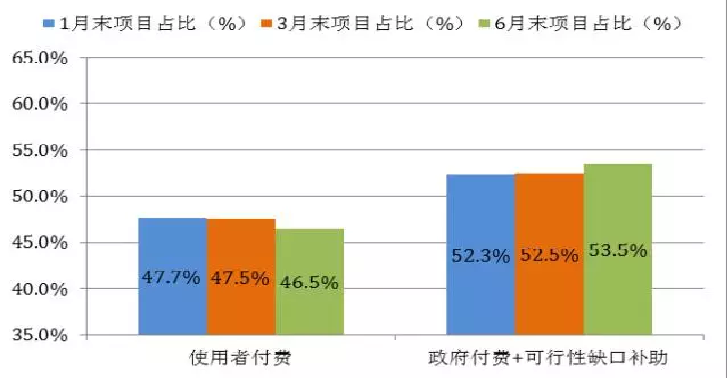 大家可以从财政部中心的数据看到1月🙇♂️、3月和6月使用者付费的项目数量对比有小幅下降。而政府负有支付责任的项目数量呈小幅上升的趋势,从投资额来看也是这样👱🏽。实际上现在这个数据跟我们想象的有一些变化,存在由于概念定义不清晰而导致项目归类的问题。我可以告诉大家,使用者付费的比例会更低,政府有支付责任的比例会更高,而实际情况跟这个还有一点出入。政府付费类及可行性缺口补助类项目占PPP项目数量和PPP项目总投资额比重在逐渐增大,纯使用者付费项目数量占比和投资额占比逐渐减小🌋,政府对PPP项目支付责任呈逐渐增大的趋势🧰。