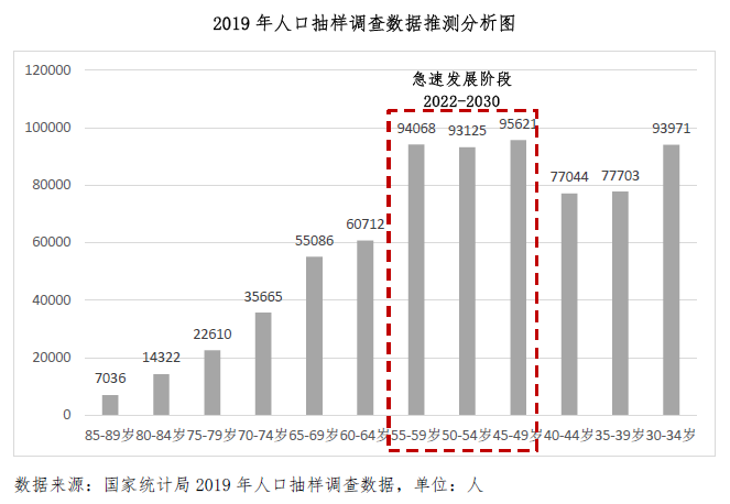 二是老龄人口迈入新阶段。狭义上来讲,养老产业服务于60岁以上的老龄人口,2022年末我国60岁及以上人口增加1268万人📄🧑,比重上升0.9个百分点;65岁及以上人口增加922万人;同时根据国家统计局2019年人口抽样调查中30-90岁人口数量来推测,即将60岁的人口将急剧增长👩🦲。且2022年开始我国迎来60岁退休高峰👨🍳,2022-2030年老龄人口将进入急速发展阶段。