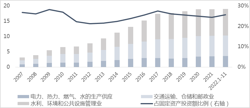 其次🧑💻,基建投资是我国实施宏观调控的重要抓手。基建投资可控性强,可在预期时间内促进经济企稳、稳定民生就业、改善市场预期,是良好的逆周期政策调节工具。千禧年以来的经济下行期中,基建投资均起到了熨平周期、稳定增长的作用。第一次是2008-2009年,面对全球金融危机,我国推出“四万亿”等财政政策,基建投资同比增速大幅提高至23%👨🏿⚕️🕡、42%,占2009年GDP比例达12.8%🤷🏼♀️,强势托底经济;第二次是2012-2013年,面对欧债危机等外生冲击,基建投资增速在2013年大幅回升至21%🫸🏽🤙🏻,叠加制造业、房地产一同刺激经济复苏;第三次是2016年,面对经济下行,基建投资在相对宽松的政策环境下维持高位,以15.71%的增速稳住经济大盘💆🏼♂️;第四次是2022年前三季度☝️,我国经济增速受疫情冲击下滑至3%,基建投资再度扛起稳增长大旗,同比增速达到11.2%,有力带动经济回归正常轨道🍷、确保运行在合理区间。