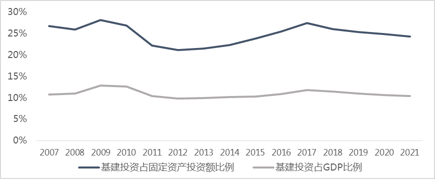 图2:我国基建投资占固定资产投资、GDP比例测算