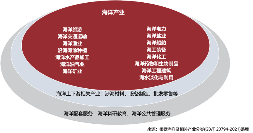 海洋产业是海洋经济最主要的组成部分。根据《海洋及相关产业分类》(GB/T20794-2021)🧒🏻,海洋经济指开发、利用和保护海洋的各类产业活动以及与之相关联活动的总和🚣🏿♀️,可以分为海洋产业🔃、海洋科研教育🤾、海洋公共管理服务、海洋上游相关产业和海洋下游相关产业。