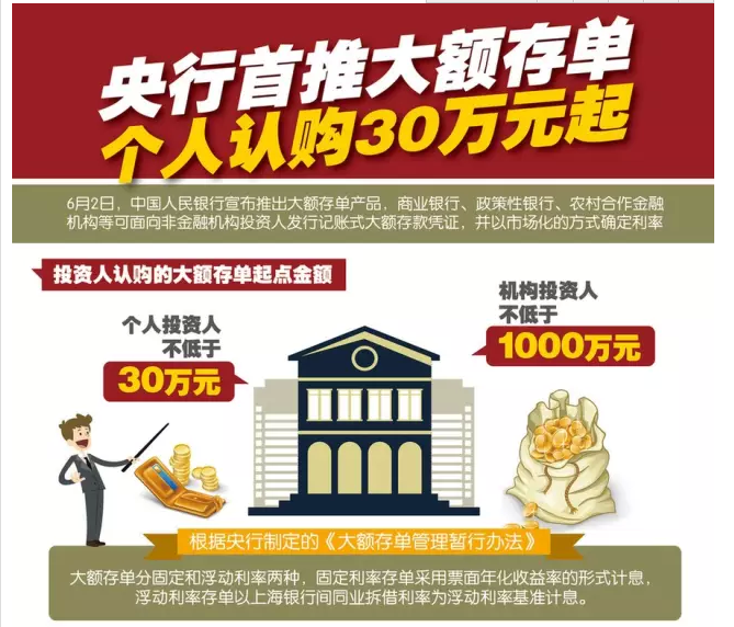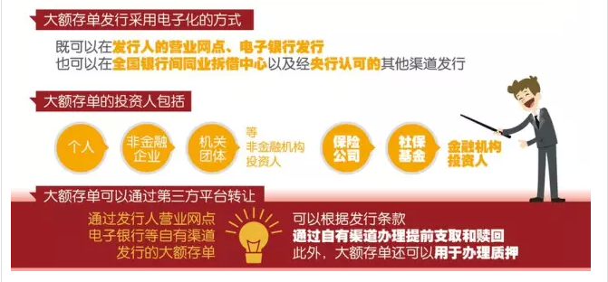 所谓大额存单,是指由银行业存款类金融机构面向非金融机构投资人发行的🚻、以人民币计价的记账式大额存款凭证,是银行存款类金融产品,属一般性存款。采用标准期限的产品形式,大额存单期限包括1个月、3个月、6个月、9个月😛、1年🎤、18个月、2年🤾🏿、3年和5年共9个品种。根据昨日颁布的《大额存单管理暂行办法》,今后个人投资人30万元以上的银行大额存单将可以摆脱目前的存款基准利率和上浮区间的限制,实行市场化定价🎭,通过二级市场转让,这将给目前银行的理财产品带来很大冲击。